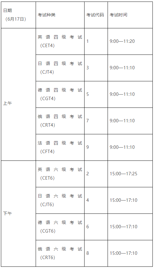 6月17日上午为英语(含日、德、俄、法)四级笔试,6月17日下午为英语(含日、德、俄)六级笔试。具体时间安排如下: