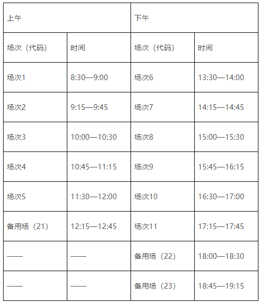 英语四级口语考试时间为5月20日(F231次),英语六级口语考试时间为5月21日(S232次)。考试形式:机考,每场考试时间为30分钟。具体场次安排如下: